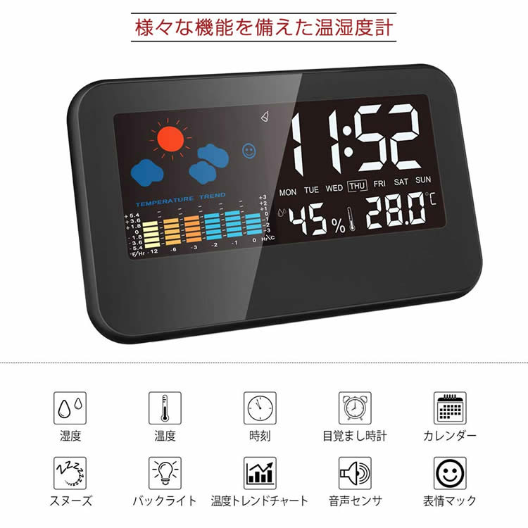 多数の機能を備えた多機能温湿度計 センサー搭載 音または振動を検知するとバックライトが点灯! 8秒間点灯した後、消灯します。